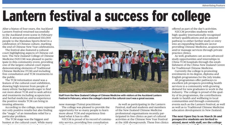 After a hiatus of four years, the Auckland Lantern Festival returned successfully to the Auckland event scene in February 2024. It attracted an estimated 150.000 people to the Manukau Sports Bowl in a celebration of Chinese culture, marking the end of Chinese New Year celebrations.The festival also featured a cultural court highlighting aspects of Chinese culture. The New Zealand College of Chinese Medicine (NZCCM) was pleased to participate in this...