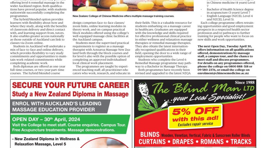 Areyoulookingtoretrainintoareward ingnewcareerworkinginthehealth sector?Areyoucurrentlyworkinginthe massagehealthcaresectororhavecom pletedalevel4massagecertificatebut wanttoupgradeyourqualifications? TheNewZealandCollegeofChinese Medicine(NZCCM)offersnationallyby hybrid/blendedlearningdeliveryboth theLevel5NZDiplomainWellnessand RelaxationMassage,andtheLevel6NZ DiplomainRemedialMassage.Thecollege hasofferedtheLevel5diplomasince2018 andhasdeliveredthelevel6diplomato distantandlocalstudentsviablended learningsince2021. Currently,NZCCMistheonlyprovider offeringlevel6remedialmassageinthe widerAucklandregion.Bothqualifica tionshaveprovedpopular,withstudents nationwidesuccessfullycompletingthe programmes. Thehybrid/blendedoptionprovides learnerswithflexibilityabouthowand wheretheystudy,alongwiththebenefits ofclassroomdeliveryanddirectcontact with,andlearningsupportfrom,tutors. Italsoenablesgreateraccessnationally asthoseoutsideofAucklandcanlinkto classesviaZoomonline. StudentsinAucklandwillundertakea mixofface-to-faceandonlinedelivery, whichprovidesflexibilitytovarystudy commitmentsandopportunitiestomain tainwork-relatedcommitmentswhile completingacademicwork. Bothdiplomasareofferedasone-year full-timecourses,ortwo-yearpart-time courses.Thehybrid/blendedcourse
