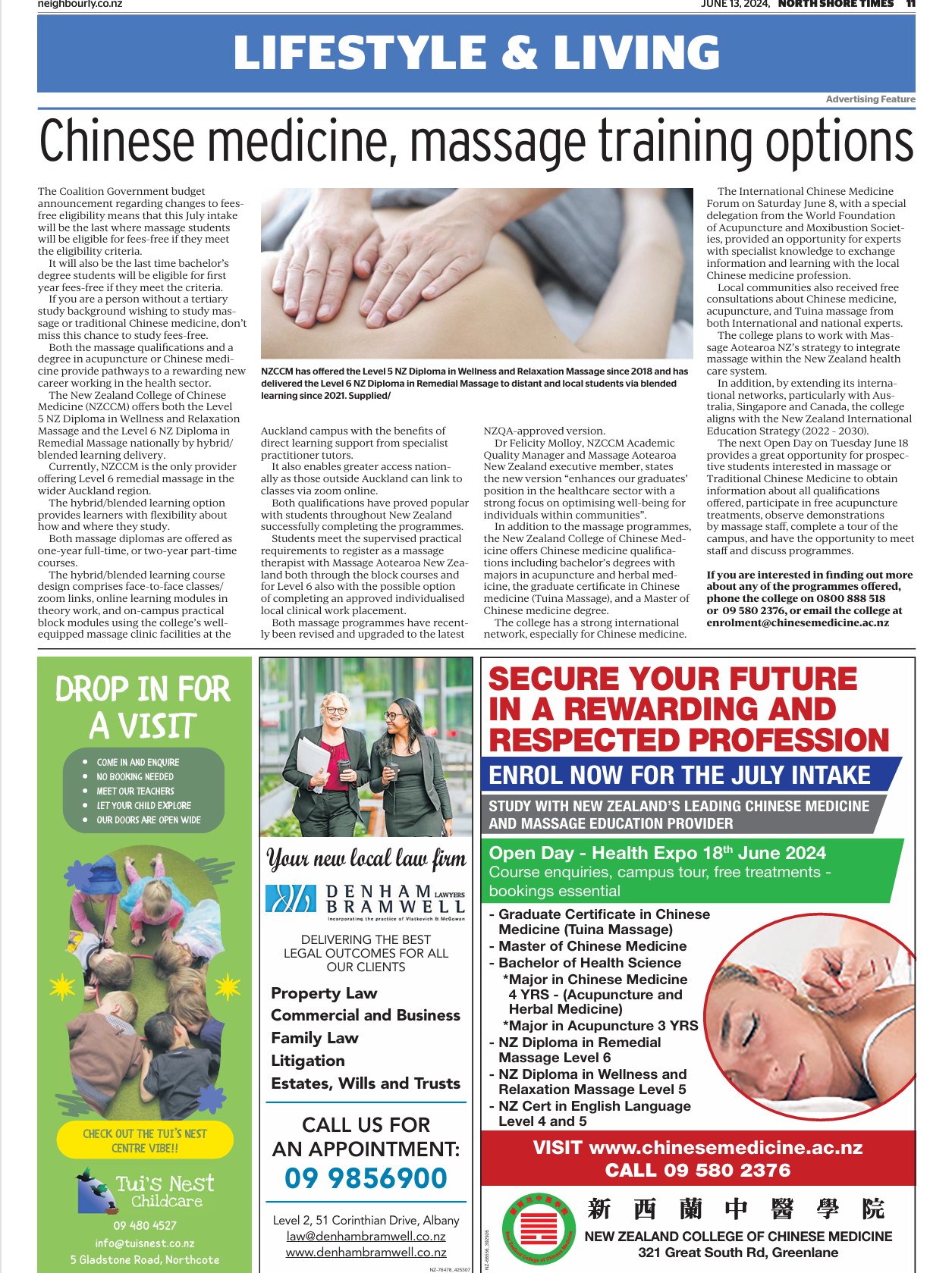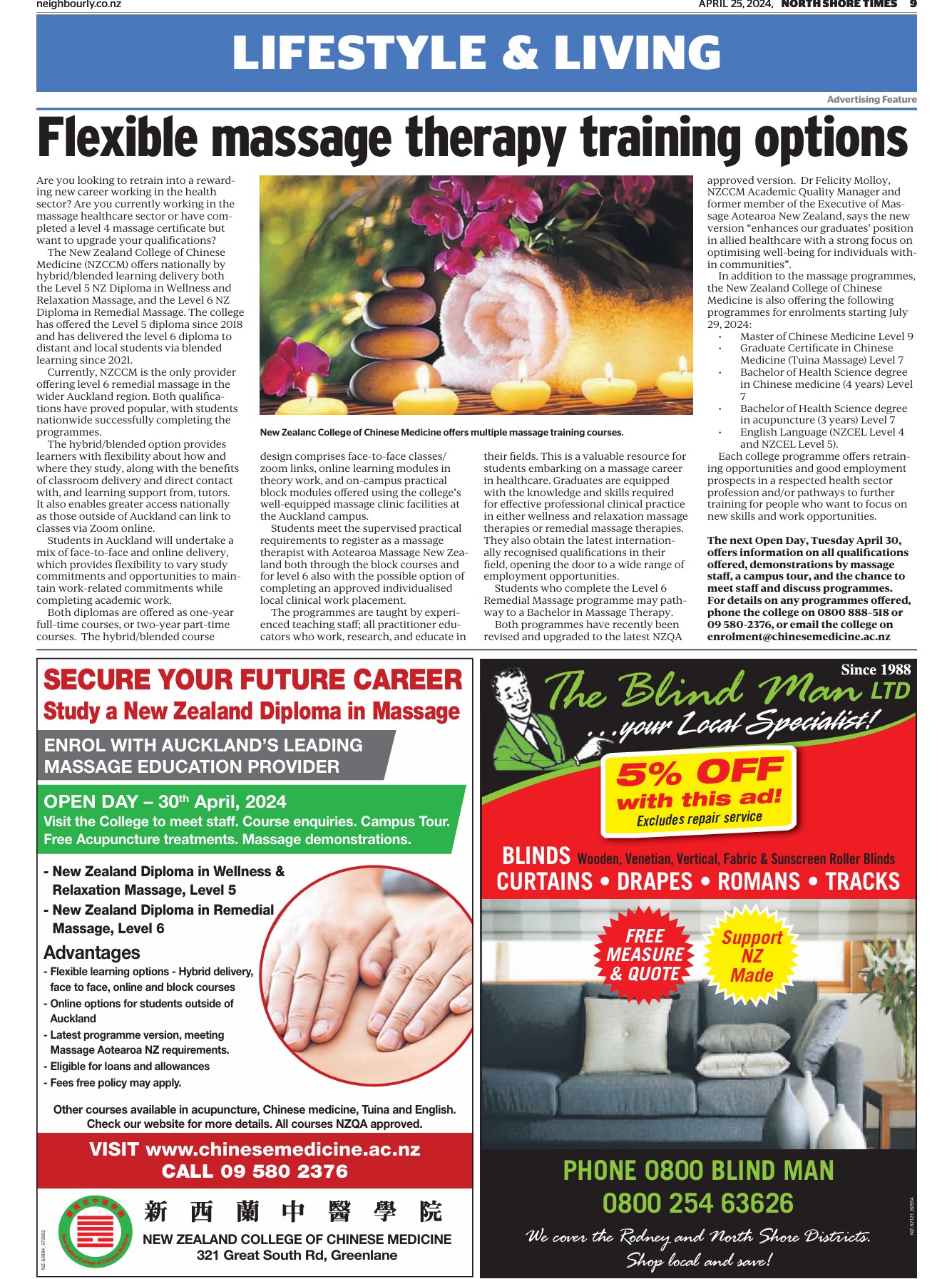 Areyoulookingtoretrainintoareward ingnewcareerworkinginthehealth sector?Areyoucurrentlyworkinginthe massagehealthcaresectororhavecom pletedalevel4massagecertificatebut wanttoupgradeyourqualifications? TheNewZealandCollegeofChinese Medicine(NZCCM)offersnationallyby hybrid/blendedlearningdeliveryboth theLevel5NZDiplomainWellnessand RelaxationMassage,andtheLevel6NZ DiplomainRemedialMassage.Thecollege hasofferedtheLevel5diplomasince2018 andhasdeliveredthelevel6diplomato distantandlocalstudentsviablended learningsince2021. Currently,NZCCMistheonlyprovider offeringlevel6remedialmassageinthe widerAucklandregion.Bothqualifica tionshaveprovedpopular,withstudents nationwidesuccessfullycompletingthe programmes. Thehybrid/blendedoptionprovides learnerswithflexibilityabouthowand wheretheystudy,alongwiththebenefits ofclassroomdeliveryanddirectcontact with,andlearningsupportfrom,tutors. Italsoenablesgreateraccessnationally asthoseoutsideofAucklandcanlinkto classesviaZoomonline. StudentsinAucklandwillundertakea mixofface-to-faceandonlinedelivery, whichprovidesflexibilitytovarystudy commitmentsandopportunitiestomain tainwork-relatedcommitmentswhile completingacademicwork. Bothdiplomasareofferedasone-year full-timecourses,ortwo-yearpart-time courses.Thehybrid/blendedcourse